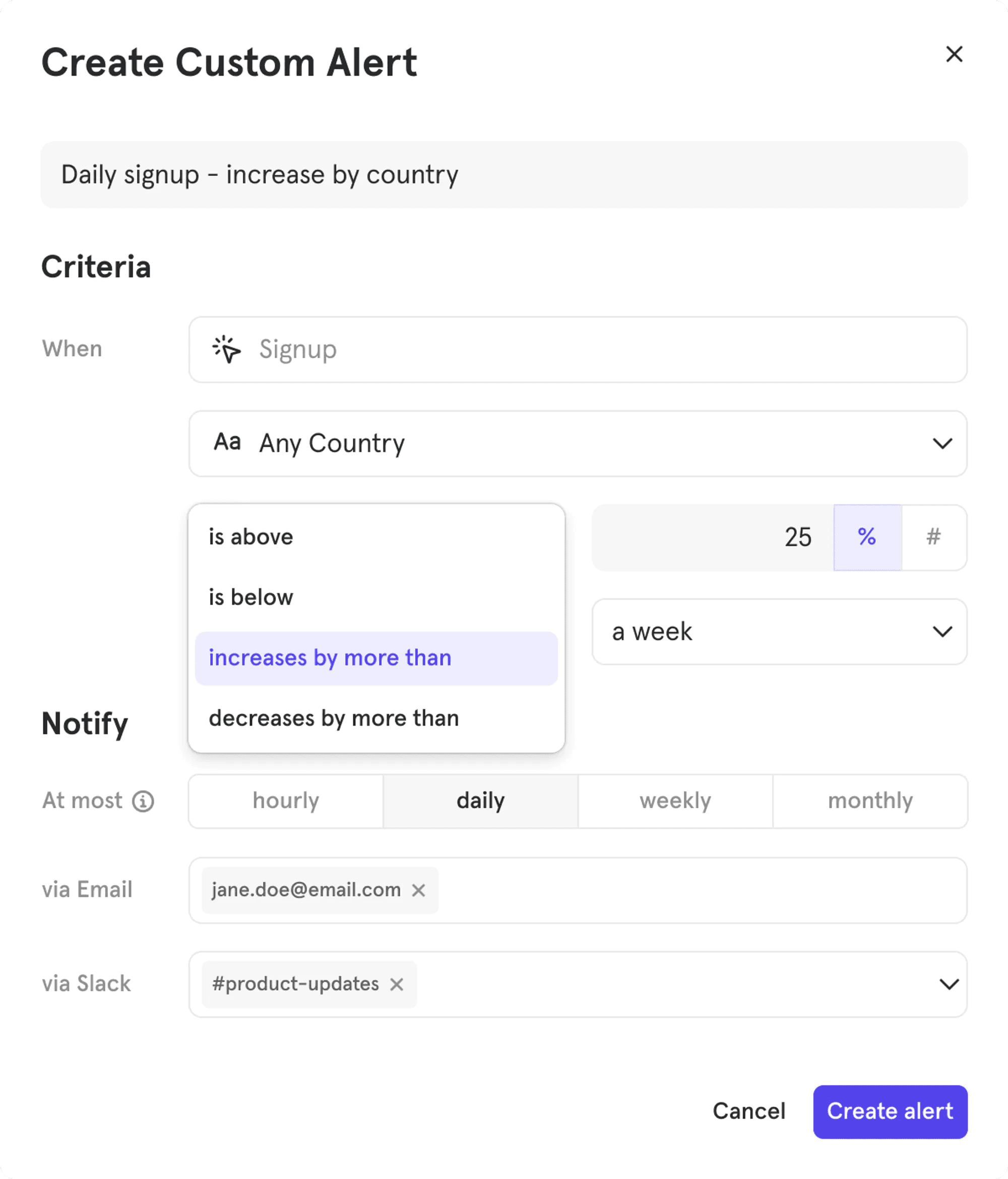 Create an alert for your Insights and Funnels reports and be notified when report conditions reach certain thresholds. Alerts are sent as an email or Slack message and can be sent to multiple users. To create an alert follow these steps: